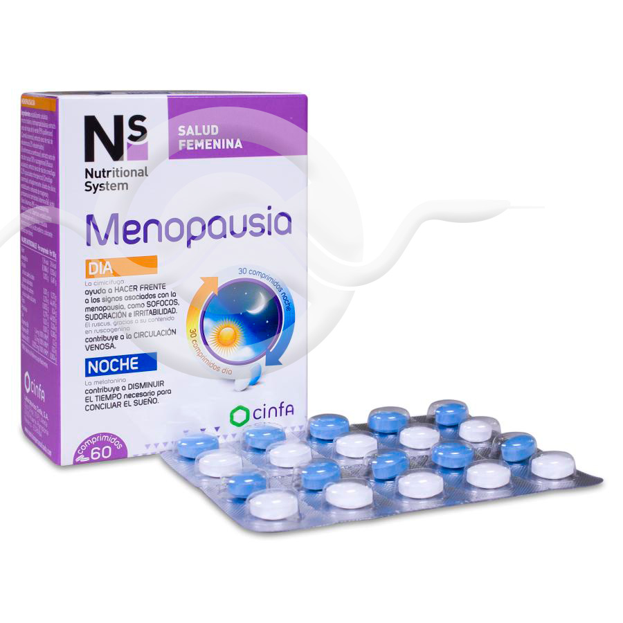 Ns Menopausia está compuesto de plantas naturales y vitaminas que ayudan a aliviar las molestias asociadas a la menopausia (sofocos, enrojecimiento, calores,nerviosismo, irritabilidad, despertares nocturnos) y a superar posibles problemas de la salud de la mujer a medio plazo (óseos, cardiovasculares).